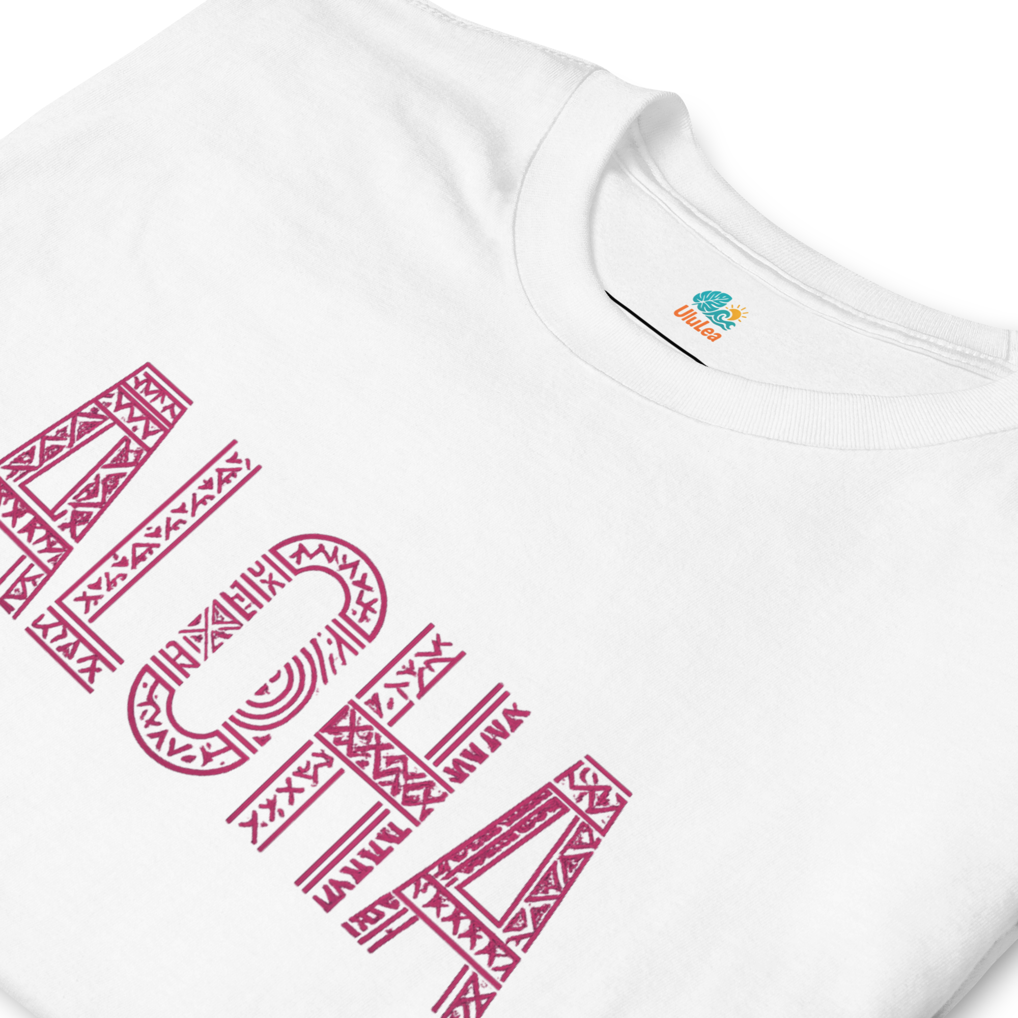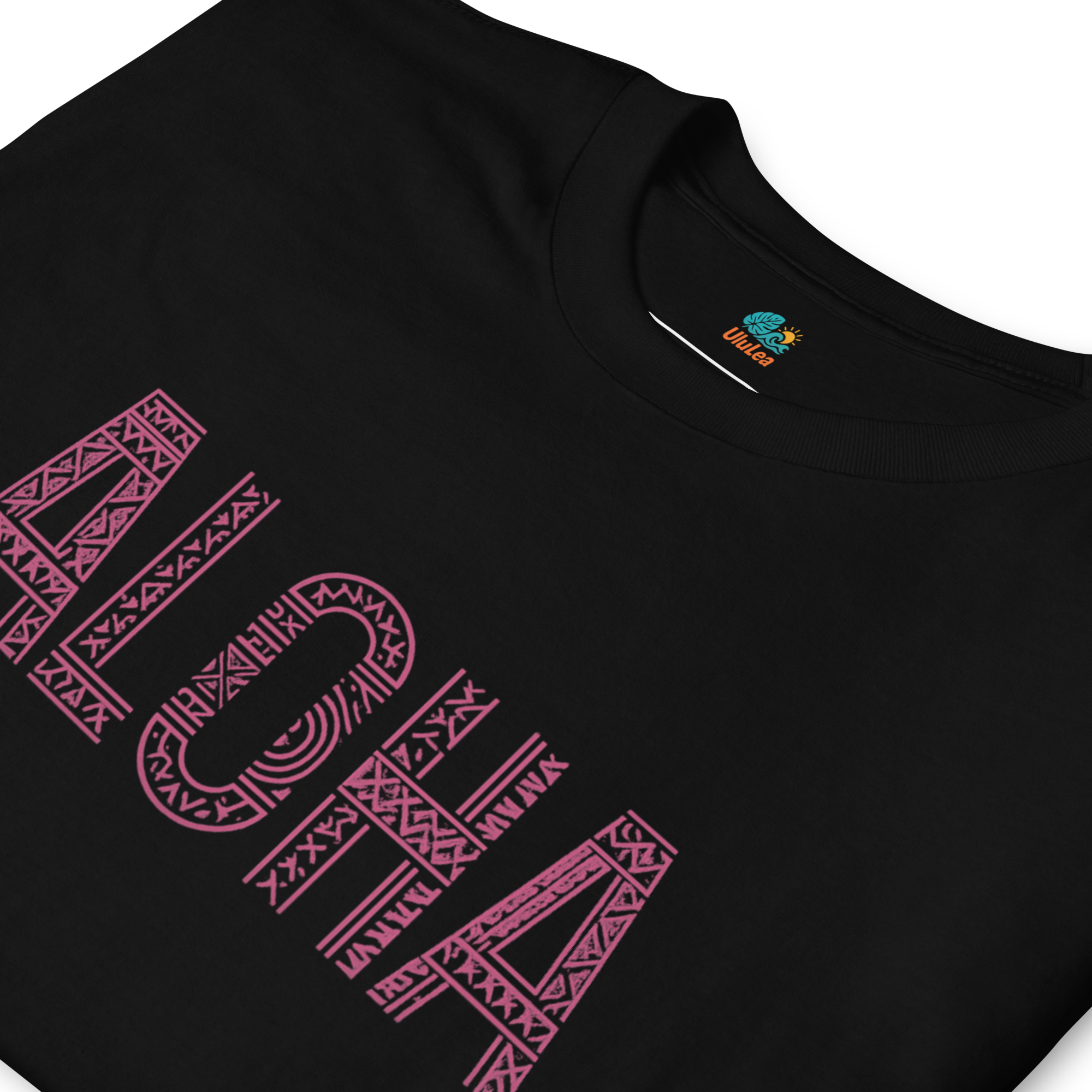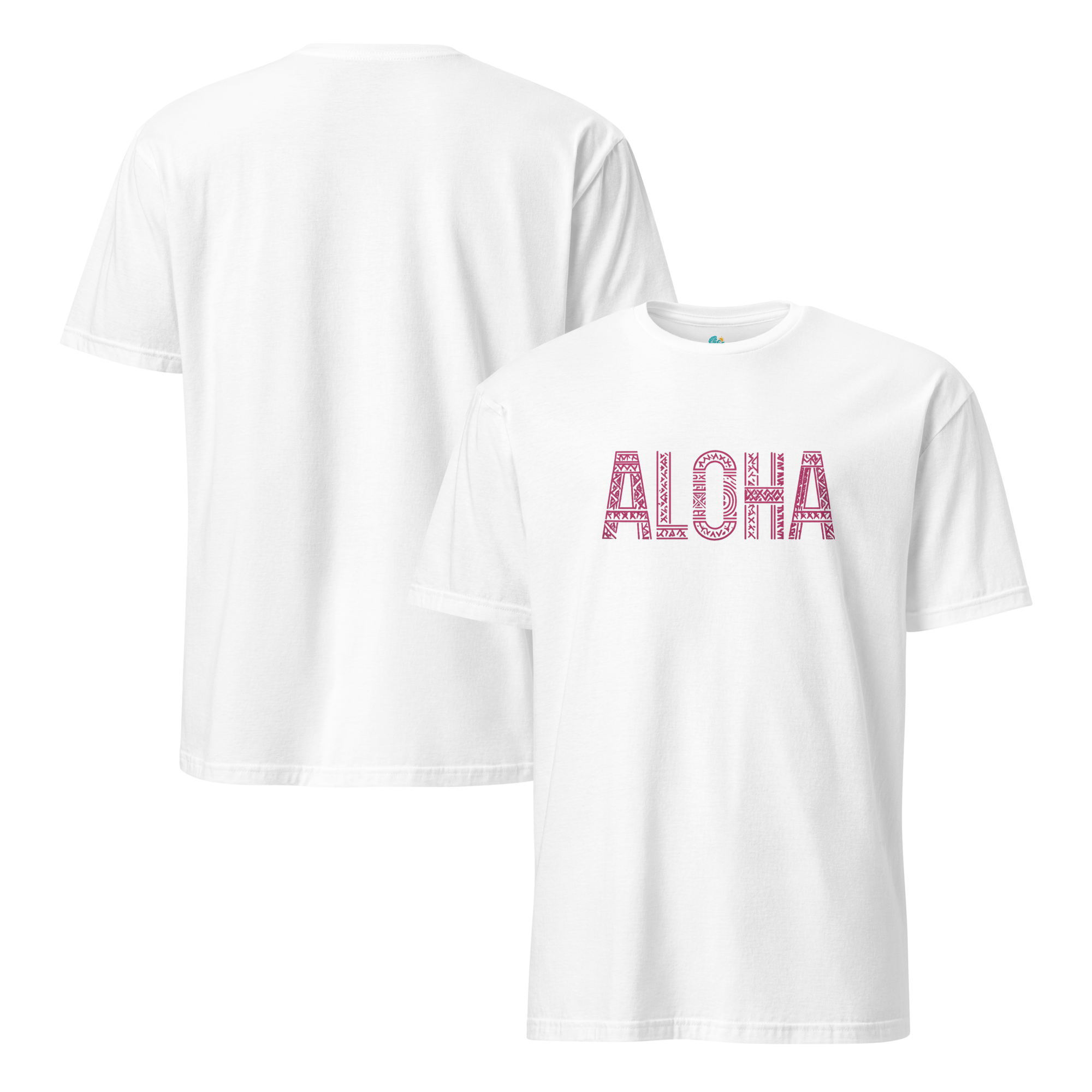 ALOHAの文字に、伝統ハワイアンモチーフをあしらった1枚。