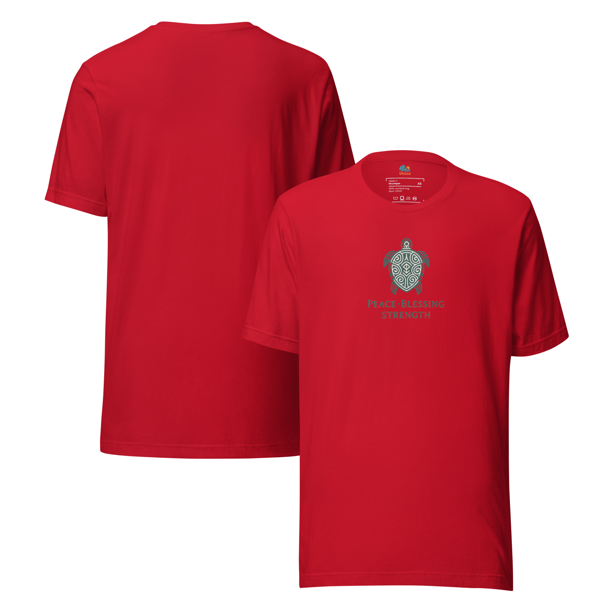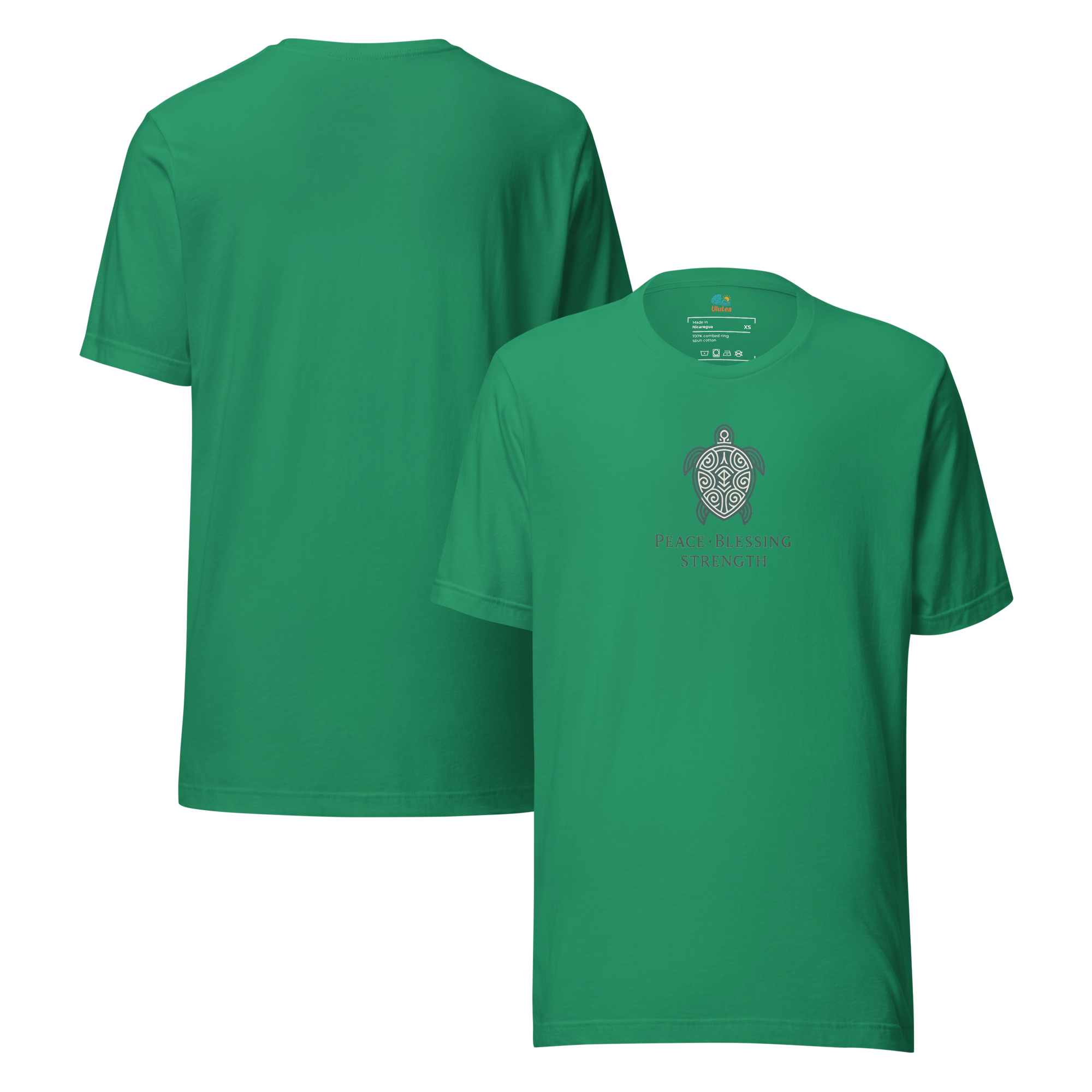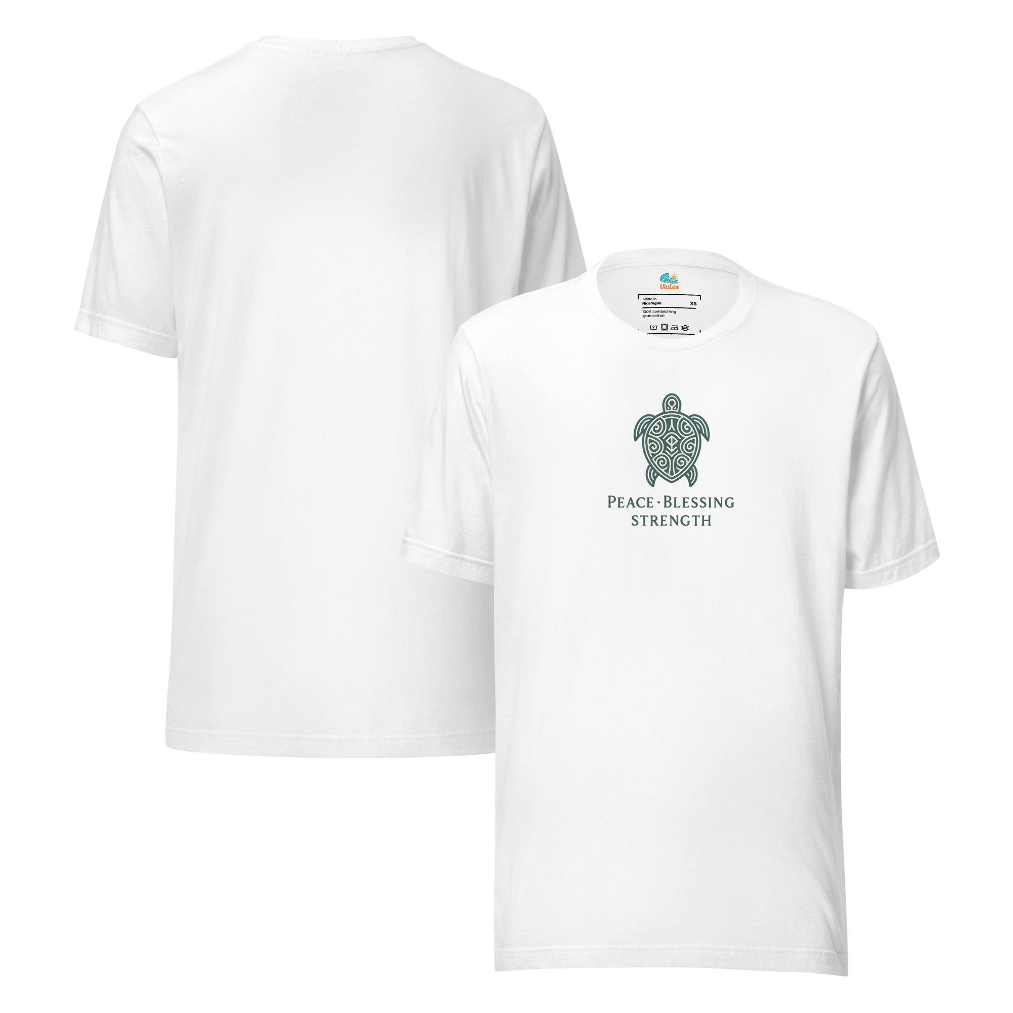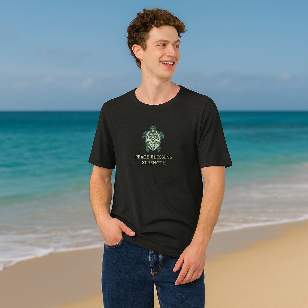 中央に描かれた海亀は、ハワイで「平和・祝福・強さ」を象徴する存在。シンプルながらも、意味を大切にしたスピリチュアルなメッセージが込められたTシャツです。