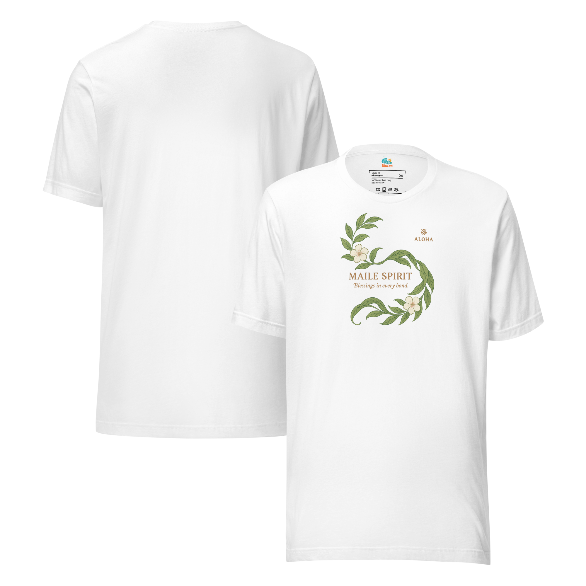 このTシャツに描かれたマイレの葉と白い花は、