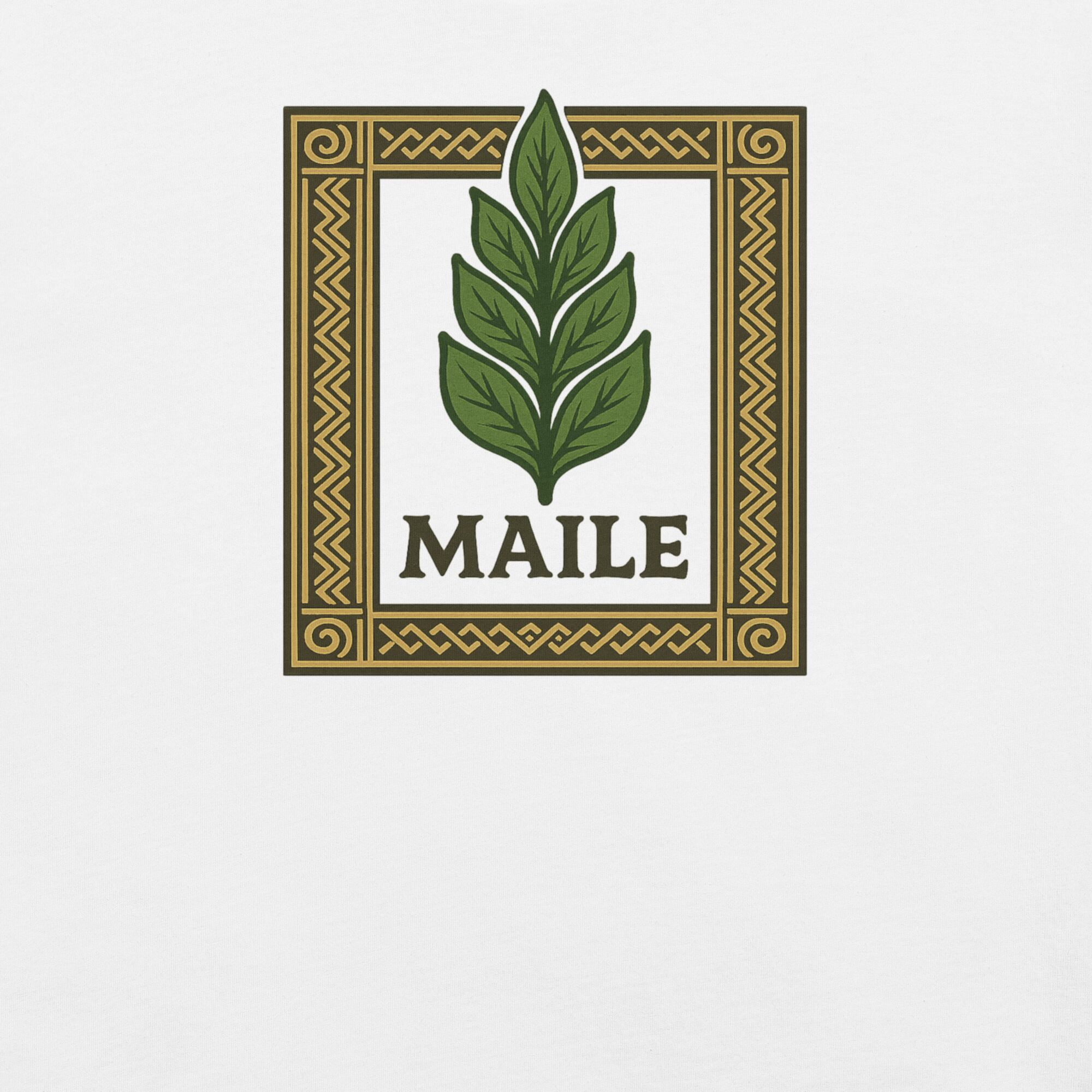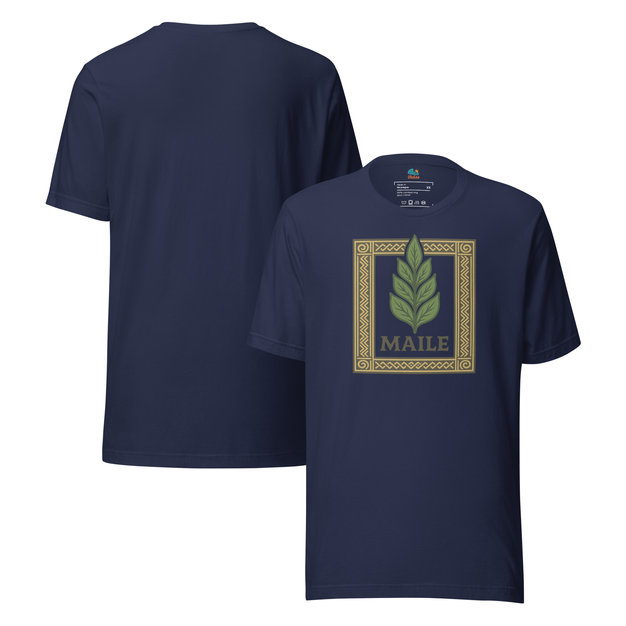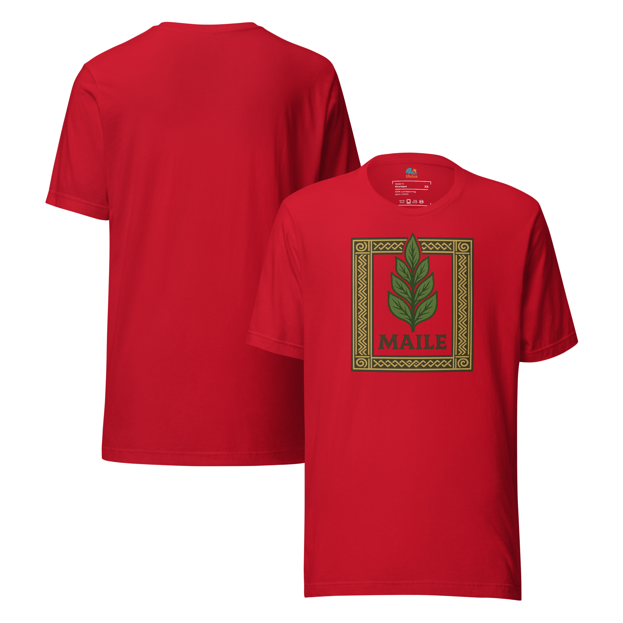 このTシャツでは、そのマイレを中央に据え、伝統文様のフレームで包み込むことで、
