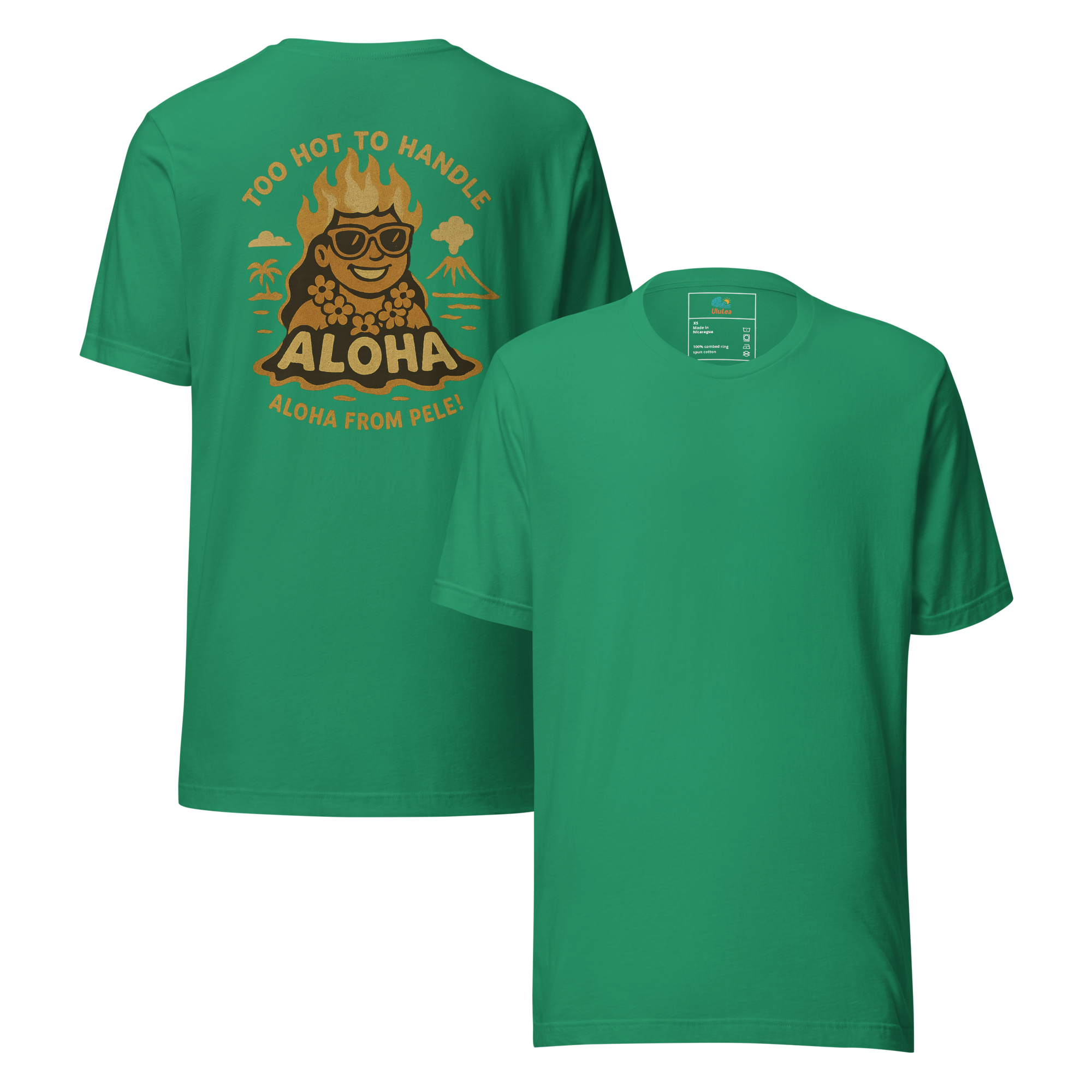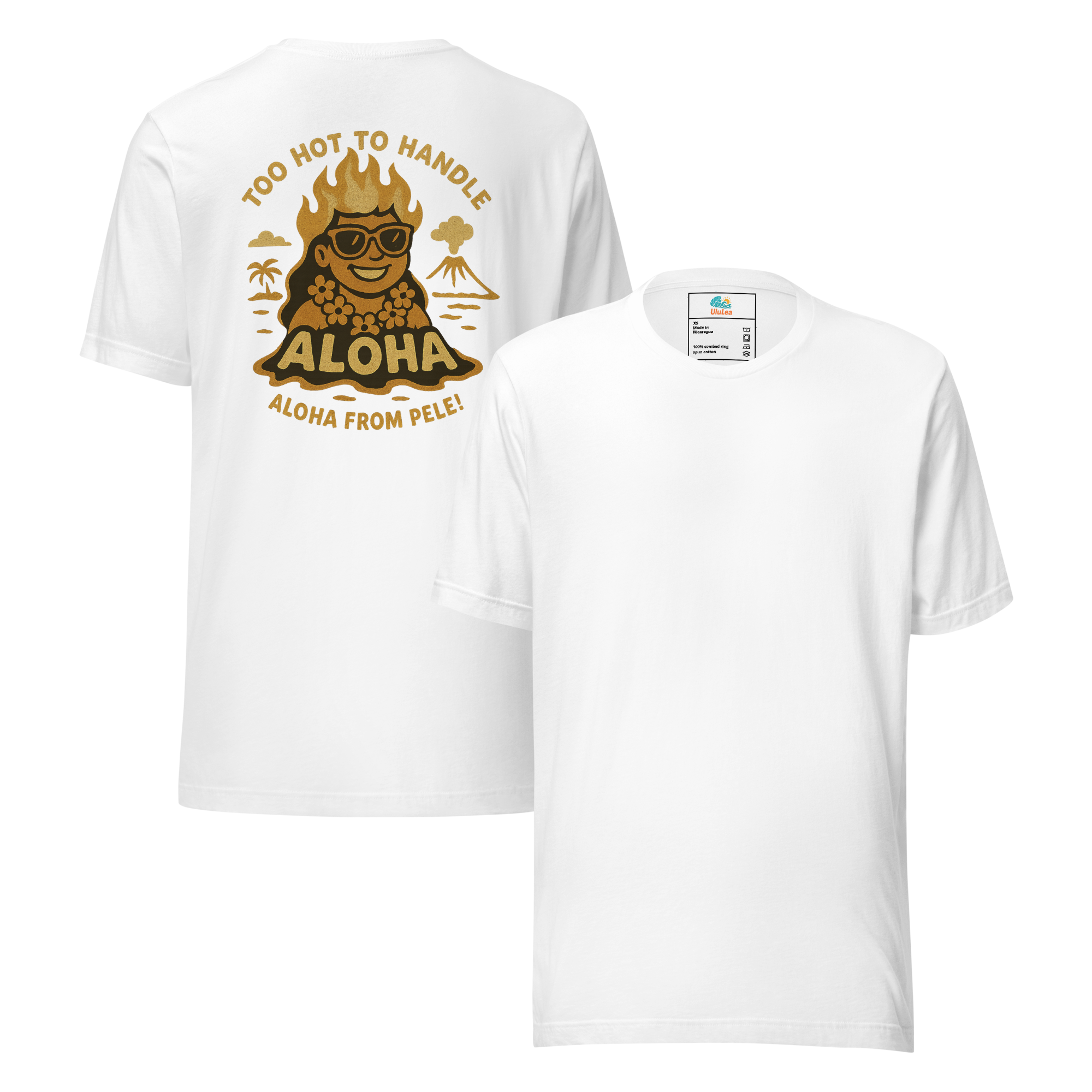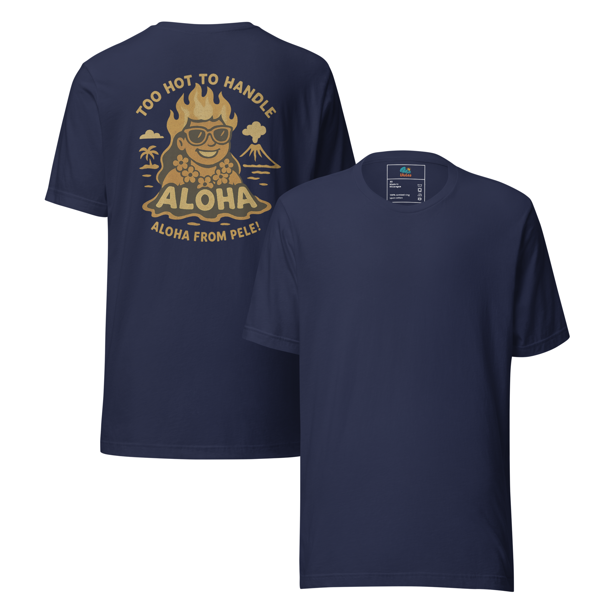 灼けるような陽射しの午後、ハワイの大地から立ちのぼる熱とともに現れたのは、陽気な笑顔を浮かべる炎の精。背中いっぱいに描かれた彼女は、島の女神・ペレ。噴き出すマグマのように情熱をまとい、「TOO HOT TO HANDLE」の言葉を携えて、あなたの日常にALOHAを届けにやってきました。